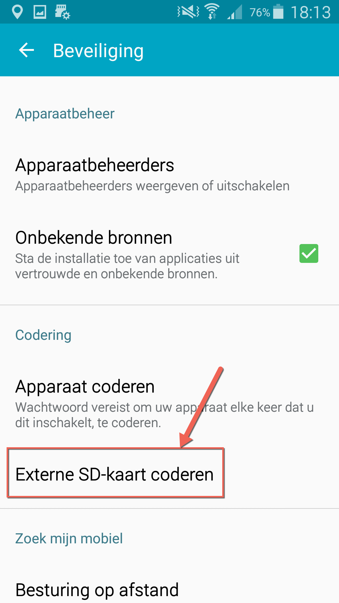 Vervolgens scroll je verder naar beneden totdat je bij de sectie Codering bent aangekomen. Hier kies je voor de optie Externe SD-kaart coderen.