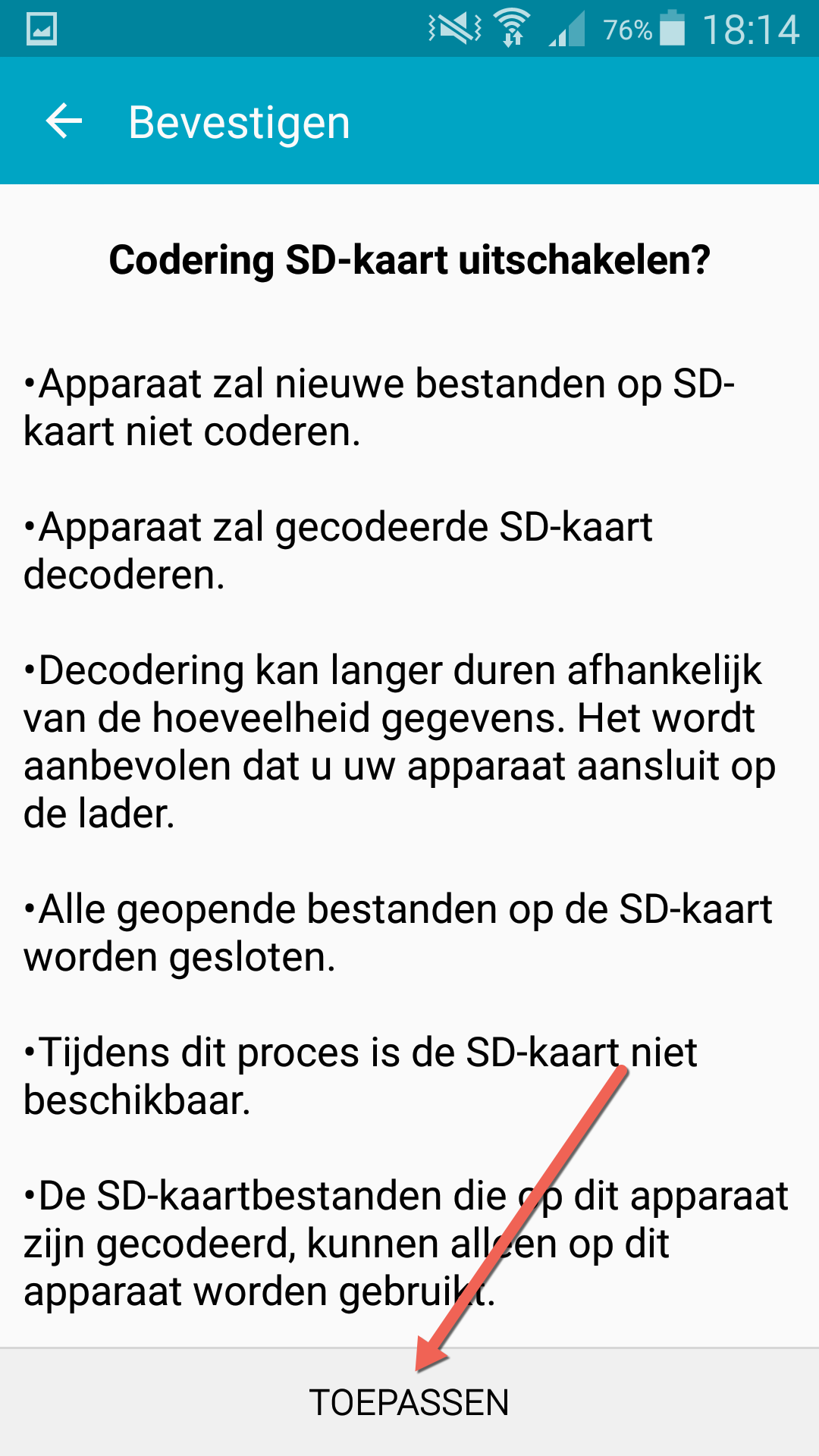 Je krijgt nu twee opties. De eerste is om je SD-kaart te coderen (dus beveiligen) en de andere optie is om hem de decoderen. Dit laatste moet je doen. Dus kies voor doorgaan om je SD-kaart te decoderen.