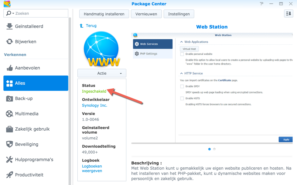 Eenmaal ingelogd op je Synology NAS moet je zorgen dat Web Station staat geïnstalleerd. Dit is een vereiste om het certificaat werkend te krijgen. Mocht dit nog niet het geval zijn dan kun je navigeren naar Package Center -> Alles -> Web Station. Zorg dat deze geïnstalleerd is.