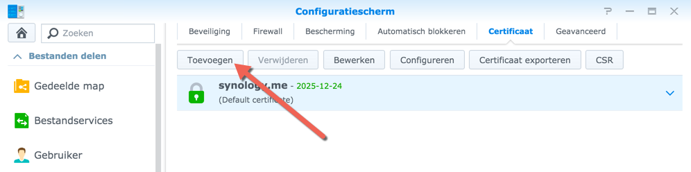 Om het certificaat te installeren ga je naar Configuratiescherm -> Beveiliging en selecteer je het tabblad Certificaat. Mogelijk heb je hier al een standaard certificaat staan, maar dit is niet erg. Kies hier voor de optie Toevoegen.