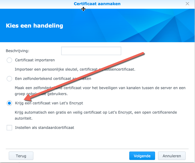 Kies nu de derde optie in het rijtje, namelijk Krijg een certficaat van Let’s Encrypt en klik op volgende.