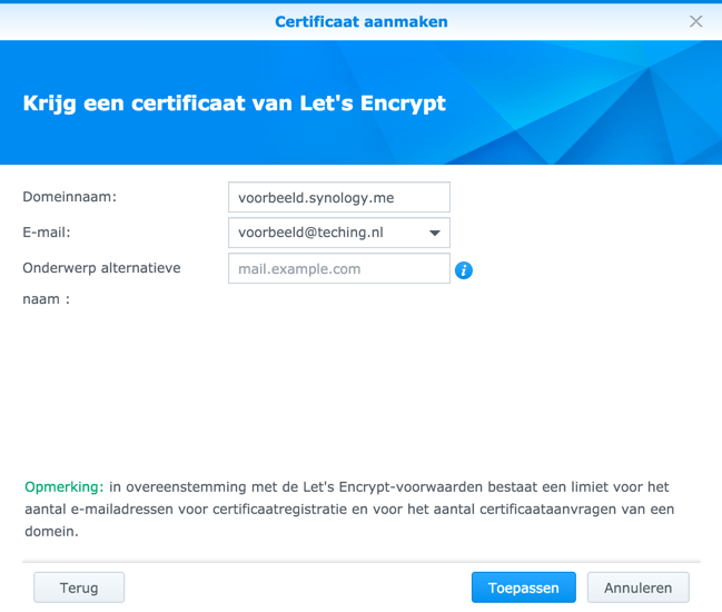 Vul vervolgens het domeinnaam in wat je al geregistreerd dient te hebben. Standaard kun je bij Synology je eigen domein.synology.me gratis aanmaken. Die dien je hier op te geven. En geef tevens een geldig e-mailadres op. Klik vervolgens op toepassen.