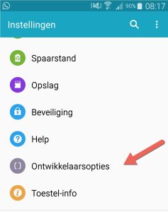 Vervolgens zie je een overzicht met informatie over je toestel, waaronder het buildnummer. Klik ongeveer 10 keer snel achter elkaar op buildnummer, totdat er een popup verschijnt. Je hebt nu de ontwikkelaarsopties enabled. Ga terug naar het menu en boven Toestel-info zie je nu Ontwikkelaarsopties zien staan. Kies voor Ontwikkelaarsopties en vink hier USB-foutopsporing aan, indien dit nog niet het geval is. Je krijgt vervolgens een popup om te bevestigen dat je deze optie aanzet, bevestig hier je keuze.