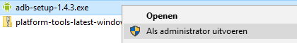 Installeer op je computer de ADB tools. Op XDA-Developers is hier een handig tooltje te vinden die voor je de belangrijkste drivers installeert. Volg de instructies zoals op die website beschreven. Simpelweg komt het erop neer dat je het gedownloade bestand moet starten onder verhoogde priviliges (rechtermuisknop -> Uitvoeren als Administrator)